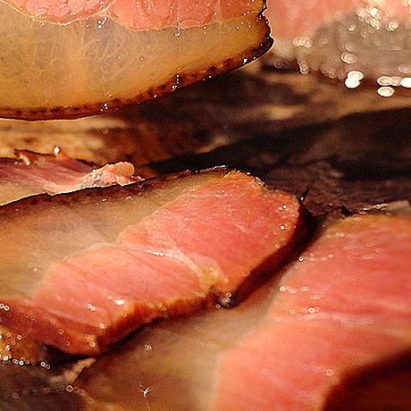 肉质红亮,咸鲜适度,并具烟香之味。酒饭均宜。腊肉和腊肠是四川人民过年过节、婚姻庆典等宴席中桌面上必不可少的食品,腊肉一般是由猪肉经过盐浸渍数日,而后经过谷草或柏树枝条树叶熏烤和凉干的工序。其独特的烟熏的香美味道令食客难以忘却。